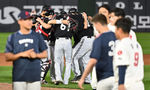 [OSEN=부산, 이석우 기자] 20일 부산 사직야구장에서 2025 신한 SOL 뱅크 KBO 리그 롯데 자이언츠와 LG 트윈스의 경기가 열렸다. 홈팀 롯데는 윤성빈, 방문팀 LG는 송승기가 선발 출전했다.LG 트윈스 선수들이 롯데 자이언츠에 17-9로 승