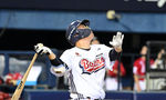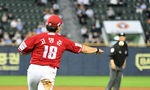 [OSEN=잠실, 지형준 기자] 20일 오후 서울 잠실구장에서 2025 신한 SOL Bank KBO리그 두산 베어스와 SSG 랜더스의 경기가 열렸다.이날 두산은 잭로그, SSG는 전영준을 선발로 내세웠다.4회말 1사 1루에서 두산 오명진이 우중간 안타를 날리