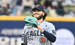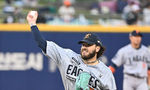 [OSEN=울산, 이석우 기자] 22일 울산 문수야구장에서 2025 신한 SOL 뱅크 KBO 리그 NC 다이노스와 한화 이글스의 경기가 열렸다. 홈팀 NC는 김녹원이, 방문팀 한화는 폰세가 선발로 나섰다.한화 이글스 선발 투수 폰세가 미소짓고 있다.