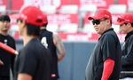 [OSEN=수원, 이대선 기자] 22일 오후 수원 KT위즈파크에서 2025 신한 SOL Bank KBO리그 KT 위즈와 KIA 타이거즈의 경기가 열렸다.KT는 쿠에바스, KIA는 양현종을 선발투수로 내세웠다경기에 앞서 KIA 이범호 감독이 훈련 중인 선수들을 바라