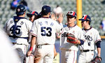 [OSEN=잠실, 지형준 기자] 25일 서울 잠실구장에서 2025 신한 SOL Bank KBO리그 두산 베어스와 NC 다이노스의 경기가 열렸다.이날 두산이 5-3 승리를 거두며 NC에 시즌 첫 승을 거뒀다.경기를 마치고 두산 선수들이 승리 하이파이브를 하