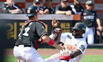 [OSEN=대전, 김성락 기자] 3일 오후 대전 한화생명볼파크에서 ‘2025 신한 SOL Bank KBO리그’ 한화 이글스와 KT 위즈의 경기가 열렸다.이날 홈팀 한화는 폰세, KT는 쿠에바스를 선발로 내세웠다.5회말 2사 1, 2루 한화 하주석의 2타점 적