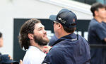 [OSEN=대전, 김성락 기자] 3일 오후 대전 한화생명볼파크에서 ‘2025 신한 SOL Bank KBO리그’ 한화 이글스와 KT 위즈의 경기가 열렸다.이날 홈팀 한화는 폰세, KT는 쿠에바스를 선발로 내세웠다.6회초 종료 후 한화 폰세, 김경문 감독이