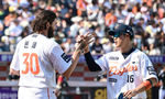 [OSEN=대전, 김성락 기자] 3일 오후 대전 한화생명볼파크에서 ‘2025 신한 SOL Bank KBO리그’ 한화 이글스와 KT 위즈의 경기가 열렸다.이날 홈팀 한화는 폰세, KT는 쿠에바스를 선발로 내세웠다.6회초 종료 후 한화 폰세, 하주석이 하이