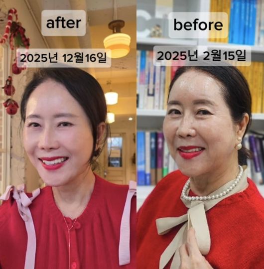 윤영미는 글과 함께 얼굴 비교 사진을 공개했다. 지난 2월 15일과 12월 16일 각각 촬영한 사진이며 세월이 거꾸로 간 듯 확 달라진 얼굴로 놀라움을 자아낸다.
