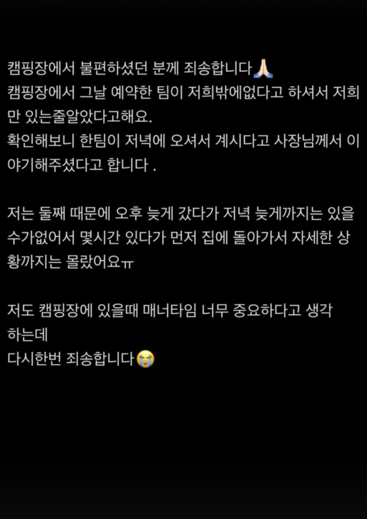 끝으로 그는 "저도 캠핑장에 있을때 매너타임 너무 중요하다고 생각하는데, 다시 한번 죄송합니다"라고 고개를 숙였다.