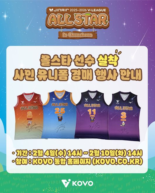 지난달 25일 춘천 호반체육관에서 진행된 진에어 2025~2026 V-리그 올스타전에 참가한 올스타 선수들의 실착 및 친필 사인 유니폼 총 38벌(올스타 미출전 선수 허수봉, 알리 제외)이 경매에 나온다. 경매는 4일 오후 2시부터 10시까지 6일간 진행된다.