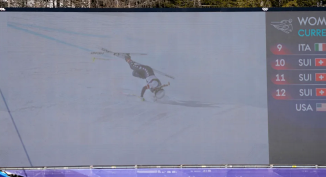 시속 100km가 넘는 속도로 질주하던 본은 두 번째 곡선 구간에서 기문에 걸렸고, 설원 위를 여러 차례 구르며 쓰러졌다. 곧바로 닥터 헬기가 투입됐고, 본은 들것에 실려 코스를 떠났다.