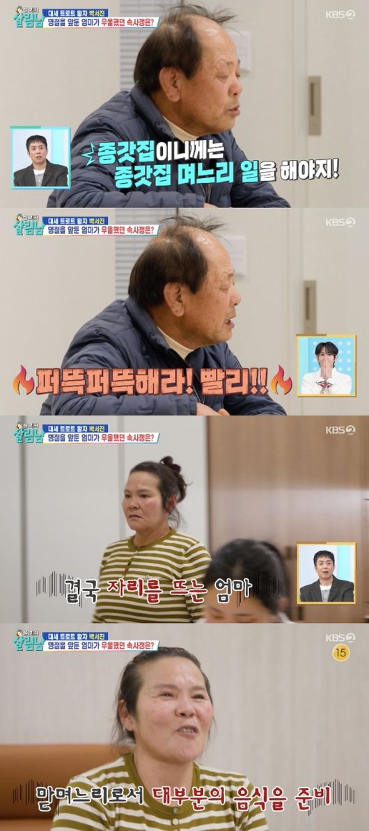 이후 어머니는 다시금 힘을 내어 콩나물을 무쳤지만, 이를 맛본 박서진의 아버지는 너무 짜다며 분노했다. 냉장고를 뒤지던 아버지는 문어가 없자 소리를 치기도. 아버지는 “정신을 어디에 뒀냐”라고 따졌고, 어머니는 “가만히 생각해 보니까 성질이 나더라”라며 함께 언성을 높였다.