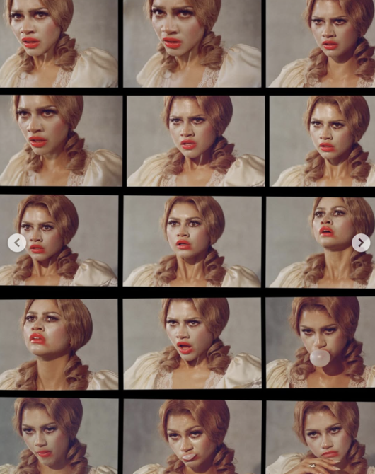 레이스 보디슈트, 플로럴 드레스, 남성복 슈트, 올가죽 룩까지 오가며 ‘젠더 벤딩’ 패션을 완벽 소화했다. 한 컷에서는 플라워 드레스를 입은 패틴슨이 얼굴을 글리터로 가린 채 무릎을 꿇고, 젠데이아가 그 위에 서 있는 도발적인 구도를 연출하기도 했다.