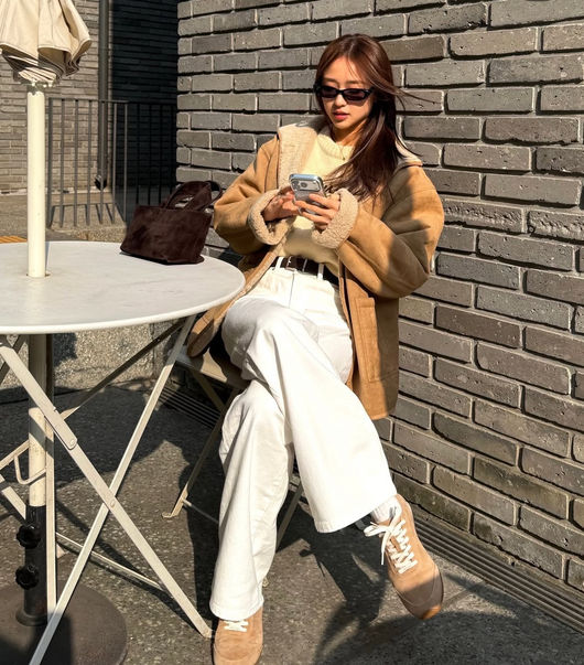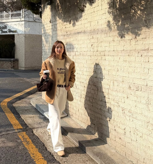 손연재는 가벼운 느낌의 무스탕에 흰 바지를 매치해 심플하면서도 밝은 느낌의 겨울룩을 고수했다. 그는 날 좋은 햇살 아래에서 여유를 만끽했다.