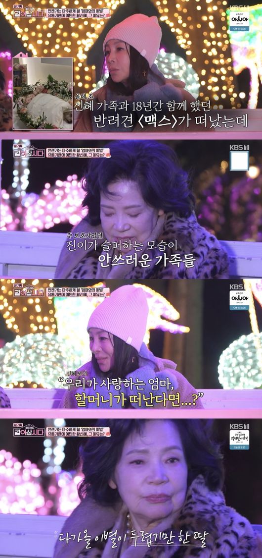 이날 황신혜는 “올해 들어서 얼마 안 됐는데 우리가 이별을 좀 했다”라며 19년간 함께했던 반려견 맥스와의 이별을 떠올렸다. 이에 어머니는 “진이 속마음이 어떻겠냐”라며 주 보호자였던 손녀딸을 걱정했다.
