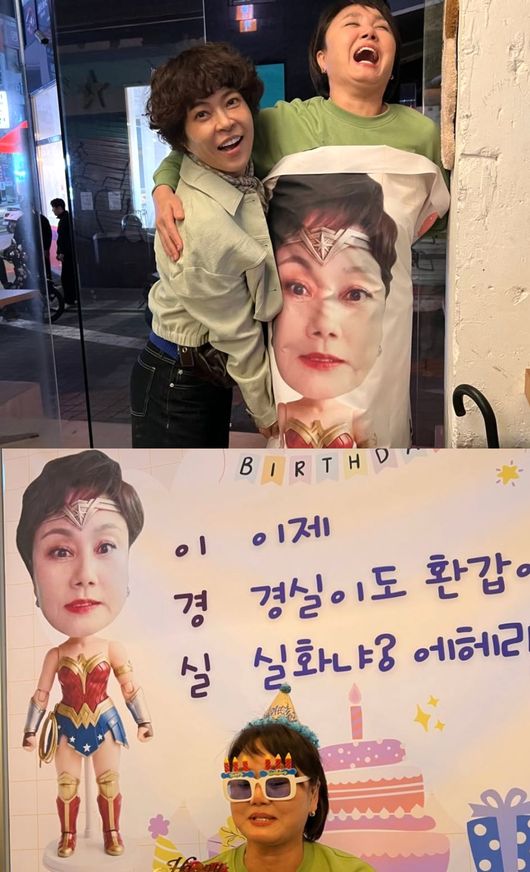 이경실은 고깔모자와 촛불 디자인 선글라스를 착용한 채 환한 미소를 짓고 있어 눈길을 끌었다. 특히 현수막에는 ‘이제 경실이도 환갑이다. 실화냐? 에헤라디야’라는 재치 있는 문구가 적혀 있어 웃음을 자아냈다.