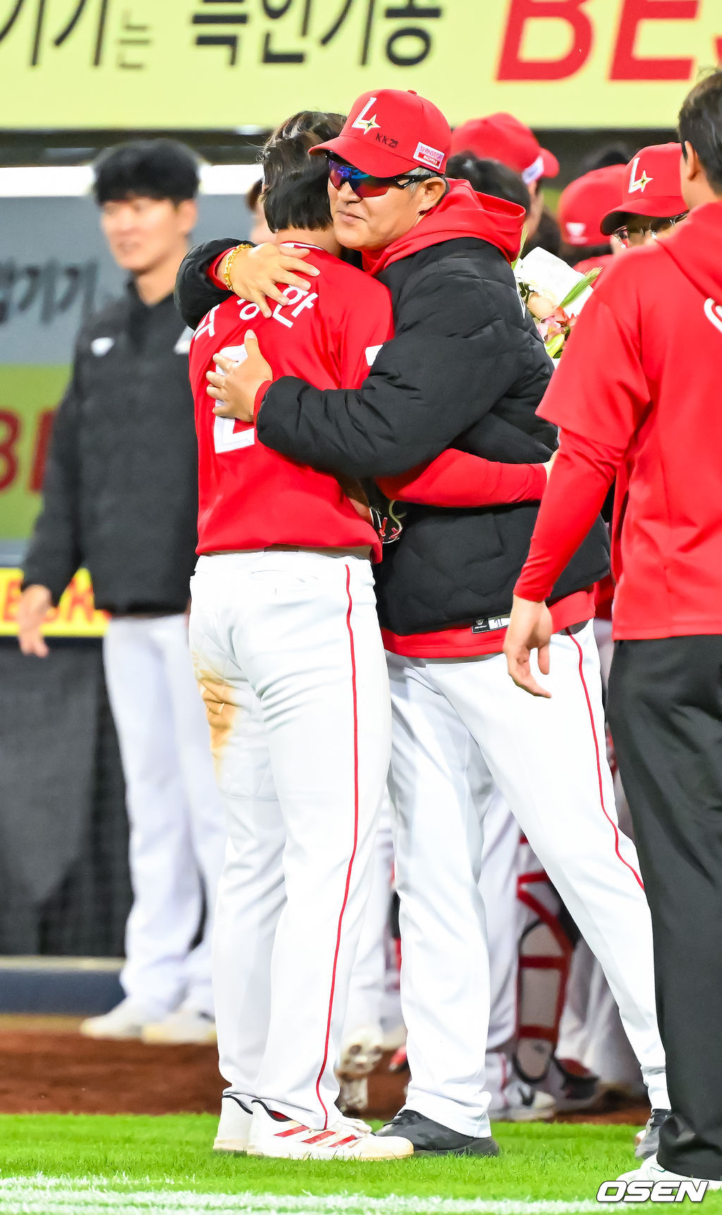 경기를 마치고 SSG 박성한이 이숭용 감독에게 신기록 축하 꽃다발을 받고 포옹을 하고 있다. 2026.04.21 / rumi@osen.co.kr