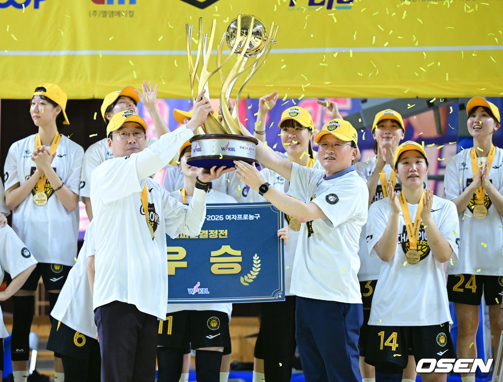 김완수 감독과 이환주 구단주가 우승 트로피를 들어올리며 기뻐하고 있다. 2026.04.26 / dreamer@osen.co.kr