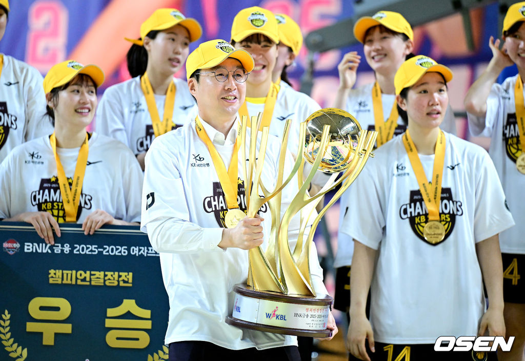 우승을 거둔 KB스타즈 김완수 감독이 트로피를 들고 미소짓고 있다. 2026.04.26 / dreamer@osen.co.kr