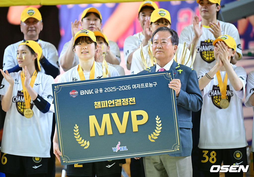 챔프전 MVP에 선정된 KB 허예은이 신상훈 WKBL 총재와 기념촬영을 하고 있다. 2026.04.26 / dreamer@osen.co.kr