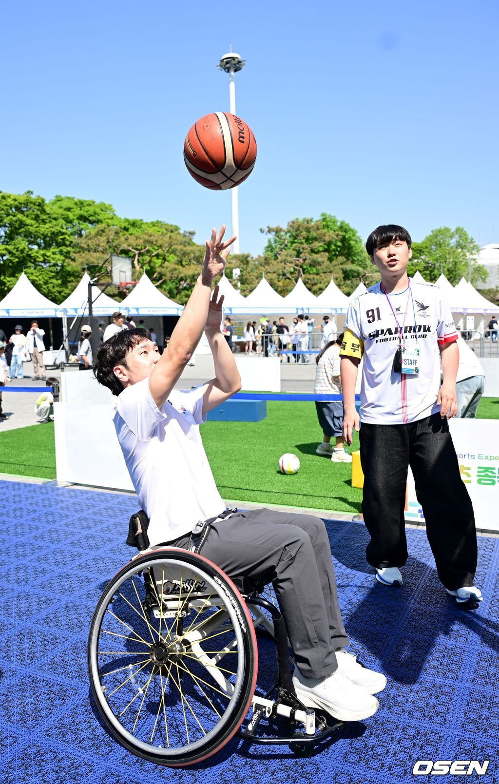 올림픽공원에서 열린 스포츠주간 기념 ‘땀송송 운동해봄제’ 장애인스포츠 체험 행사장에서 이제혁 선수가 휠체어농구를 체험하고 있다. 2026.04.27 /cej@osen.co.kr