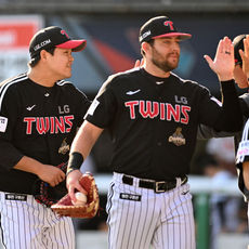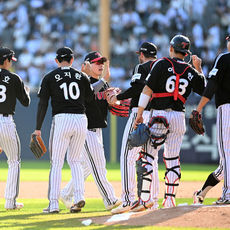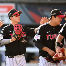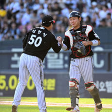 염경엽 감독과 승리의 기쁨 나누는 장현식