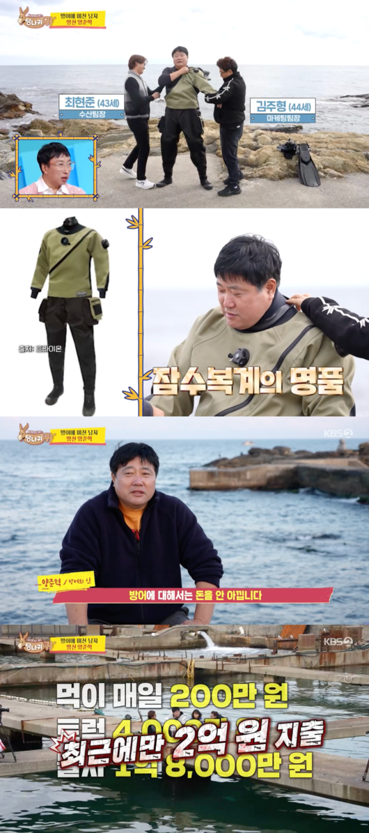 이날 양준혁은 수산팀장과 마케팅팀장의 도움을 받아 잠수복을 착용했다. 양준혁이 착용하는 잠수복은 약 250~300만원으로 특수제작된 잠수복으로 더욱 비싸다고.