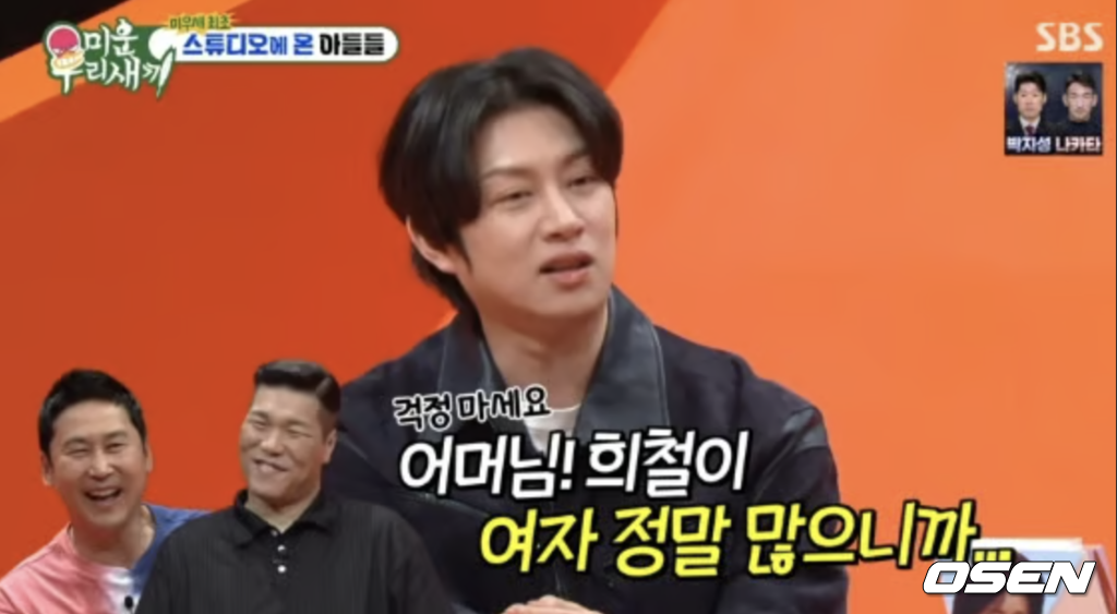 이어 김희철은 “형들이 카메라 안 돌아갈 때 엄마한테 ‘희철이 여자 많다’ 이런 얘기 좀 하지 마라. 엄마가 전화와서 누구 만나냐고 물어본다”며 엄마의 잔소리를 고백했다.