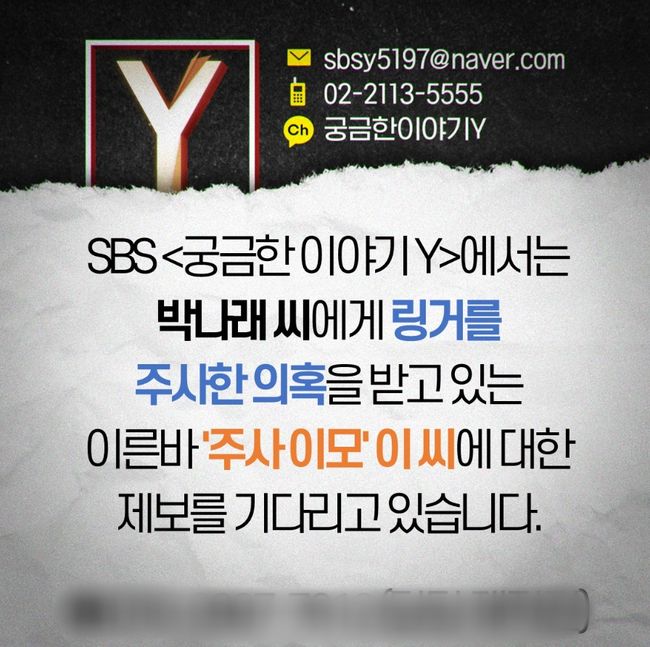 8일 SBS ‘궁금한 이야기 Y’ 측은 공식 계정을 통해 “박나래 씨에게 링거를 주사한 의혹을 받고 있는 이른바 ‘주사 이모’ 이 씨에 대한 제보를 기다리고 있습니다”라고 밝혔다.