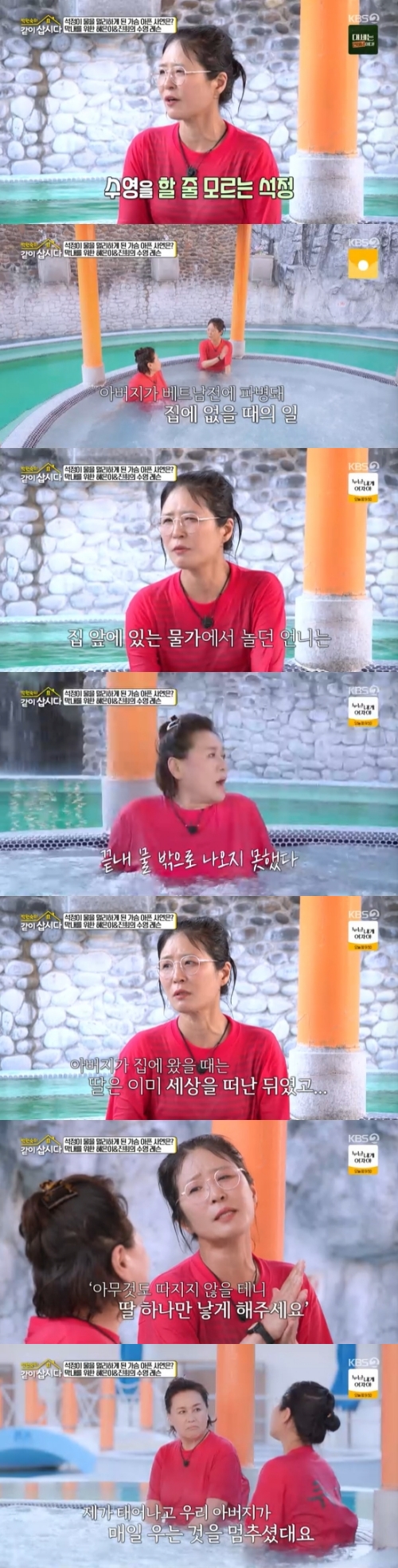 수영을 하지 않는 이유에 대해 "언니가 있었는데 우리 아버지가 베트남 파병 갔을 때 언니가 어린 나이에 집 앞에 있는 물에서 못 나왔다. 내가 태어나기 전의 일"이라며 "그래서 아버지가 돌아왔을 때 사랑하는 딸이 없으니까 계속 울기만 하고 술만 드셨다"고 털어놨다.