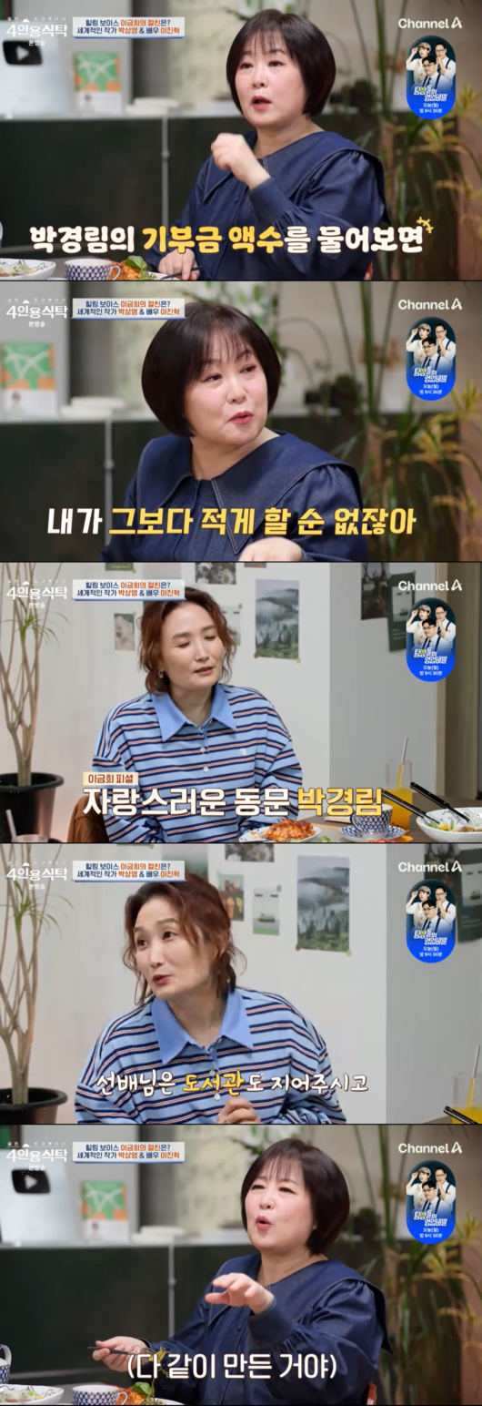 '절친 토큐멘터리 – 4인용식탁' 이금희와 박경림이 고등학교 동문임을 밝히며, 이금희 아나운서의 통 큰 모교 기부 스케일에 얽힌 유쾌한 비하인드 스토리를 공개했다.