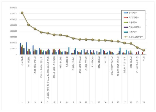 5위, 서울 자가에 대기업 다니는 김 부장 이야기 브랜드는 참여지수 542,864 미디어지수 513,105 소통지수 801,373 커뮤니티지수 999,860 시청지수 803,192가 되면서 브랜드평판지수 3,660,395로 분석됐다.
