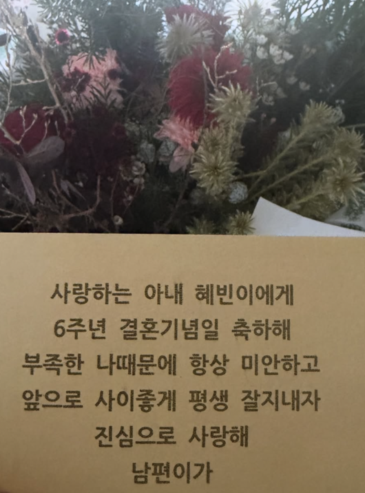 특히 전혜빈의 남편이 결혼 6주년을 맞아 보낸 꽃다발 카드가 눈길을 끌었다. 카드에는 “사랑하는 아내 혜빈이에게. 6주년 결혼기념일 축하해. 부족한 나 때문에 항상 미안하고 앞으로 사이좋게 평생 잘 지내자. 진심으로 사랑해. 남편이가”라는 진심 어린 메시지가 담겨 있어 보는 이들도 흐뭇하게 했다.
