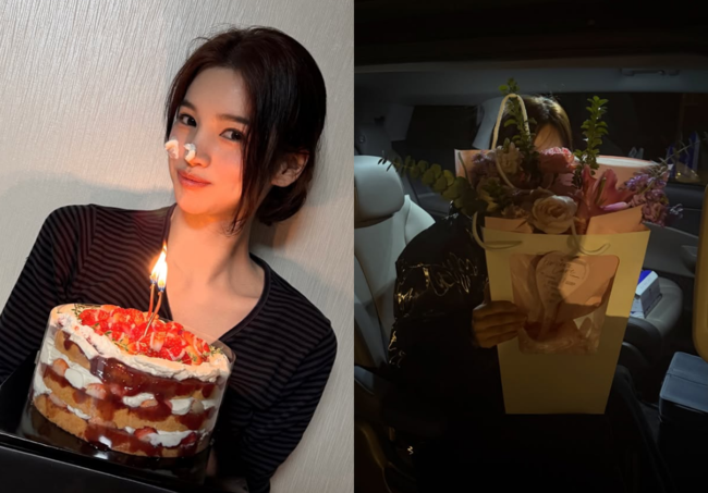 안유정은 하트모양 초가 두 개 꽂힌 조각 케이크를 든 채 밝게 미소짓는 모습. 이어 또 다른 사진에는 보다 커다란 케이크를 품에 안은 안유정이 담겼다. 그는 생크림을 얼굴에 묻힌 채 행복한 생일을 만끽했다.