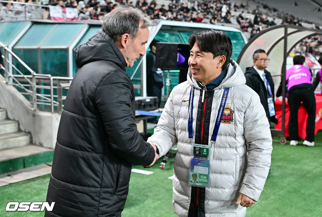 경기 앞서 FC서울 김기동 감독이 멜버른 시티 오렐리오 비드마 감독과 악수를 나누고 있다. 2025.12.10 / soul1014@osen.co.kr