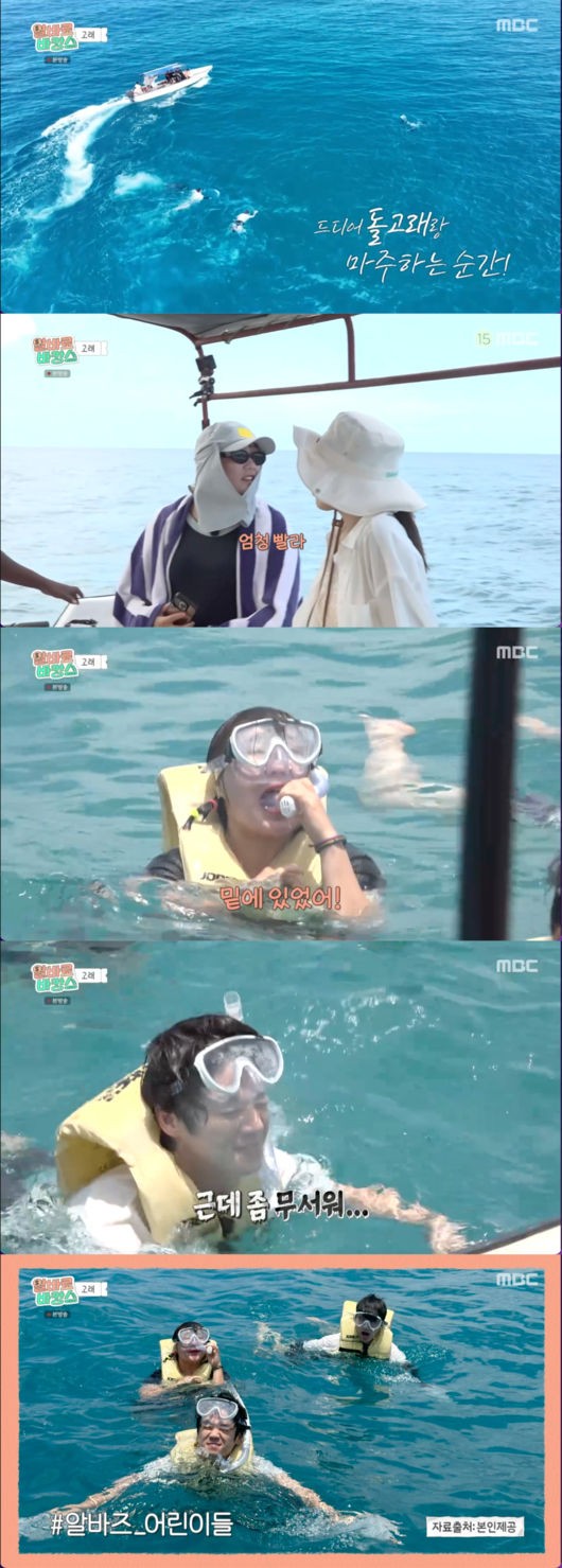 물속에서 발아래로 헤엄치는 돌고래들을 직접 목격하며 벅찬 감탄을 쏟아냈다. 이수지 역시 "밑에 있었어"라고 말하며 신기함을 감추지 못했다.