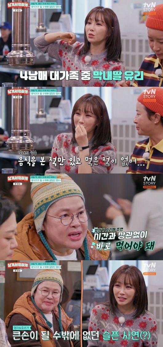 공감한 이영자는 “우리 집은 유리네랑 다른데 엄마가 일이 바빠서 제때 챙겨주지 못했다. 그래서 요리를 해주면 시간과 상관없이 먹어야 된다. 음식이 다 끝날 때까지 이때 아니면 못 먹으니까. 사람들이 ‘몇 인분 먹어?’ 하는데 난 그냥 끝날 떄까지 먹는다”라고 전했다. 이에 김숙은 “둘이 결이 비슷하다”라며 놀라워했다.