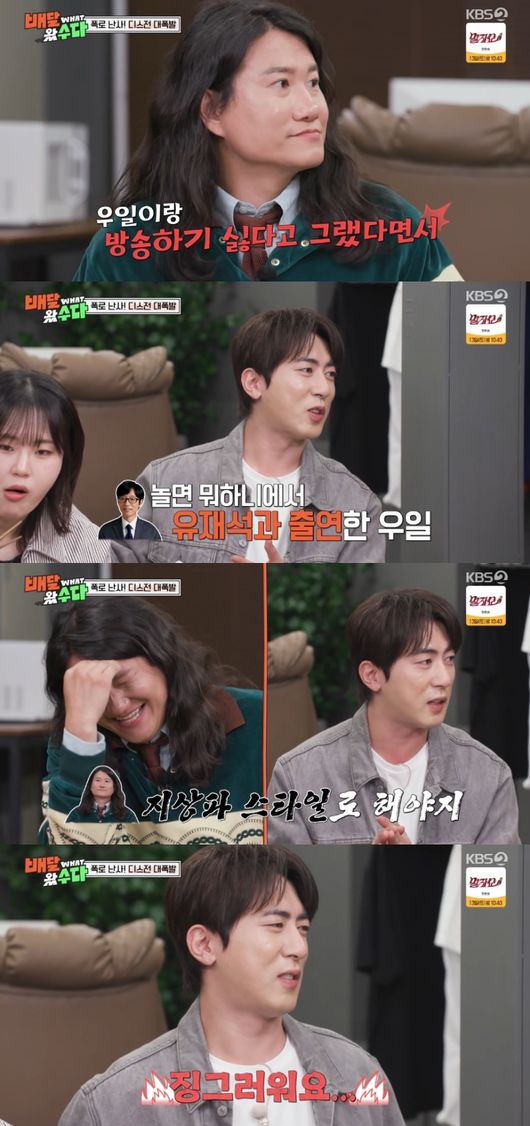 10일 방송된 KBS 2TV 예능 ‘배달왔수다’에서는 임우일, 김원훈, 엄지윤이 등장해 서로 디스하는 모습이 그려졌다.