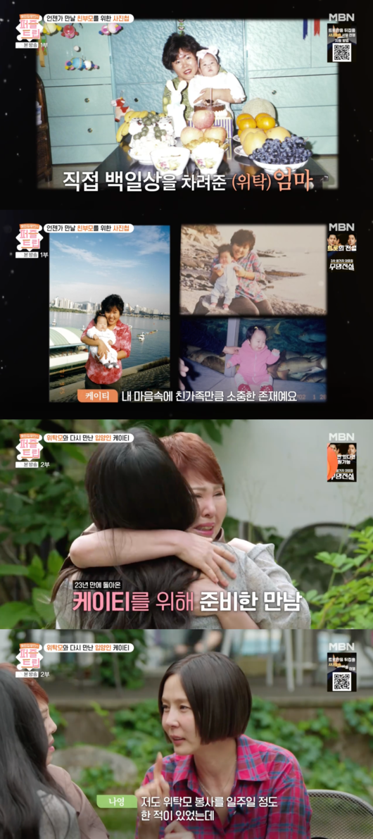 김나영은 케이티의 어린시절 사진을 보며 이야기를 이어갔다. 생후 100일도 안돼 위탁모에 맡겨졌다는 케이티는 “서울에서 5개월 정도 저를 정성껏 돌봐주셨다”고 회상했고, 위탁모는 직접 백일상을 차려주기까지 했다고.