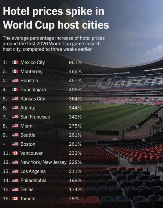 이번 북중미 월드컵은 경기의 75%가 미국, 나머지 25%가 캐나다와 멕시코에서 개최된다. 디 애슬레틱이 개최 도시의 96개 호텔을 조사한 결과 평균 1박당 가격은 불과 3주 만에 293달러(약 43만 원)에서 1013달러(약 149만 원)까지 폭등했다. 평균 328% 상승이다.