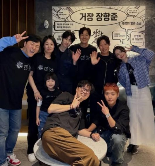사진 속 '왕사남' 팀은 장항준 감독을 필두로 주인공 단종 역의 박지훈과 엄흥도 역의 유해진을 비롯해 한명회 역의 유지태, 매화 역의 전미도, 엄흥도 아들 태산 역의 김민, 막동아재 역의 이준혁, 막동어멈 역의 김수진, 영화의 막내였던 막동이 역의 박지윤까지 모두 한자리에 모여 훈훈함을 자아냈다. 특히 '센터'인 중앙에는 장항준 감독이 마치 아이돌처럼 유쾌한 포즈를 취해 '천만 거장'의 순간을 만끽해 웃음을 더했다.