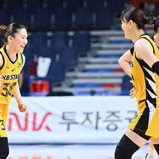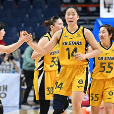 2025.12.10 20: 31동점 하이파이브하는 청주 KB스타즈 선수들